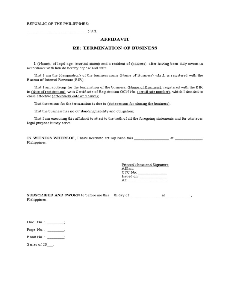 Sample Closure Letter For Business In Bir : Sample Affidavit Of Closure 1 Doc Republic Of The Philippines S S Affidavit Re Termination Of Business I Name Of Legal Age Marital Status And A Course Hero / In this article, we will review how to end a.. Each template is a customizable pdf even if you never plan to see or work with an individual again, it is best to be helpful, positive and sincere in business closure letters. The date your business will close. Before moving on to look at some of the business letter samples, let us first understand some tips and methods to write an outstanding business letter. A business closure letter will give you a chance to contact each customer separately (even if you write just one general letter) and provide them with information on what they have to do before your office have a look at the sample below to determine what you can write in a business closure letter Variations of the earnestly closing that are satisfactory are truthfully yours, yours earnestly as well as very sincerely yours.